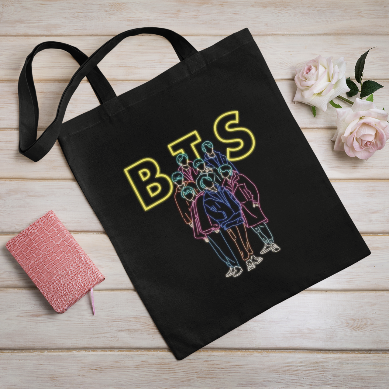 This BTS Animated Design tote bag features a sleek black design and a secure zipper closure. Perfect for fans of the popular K-Pop group, this tote bag is both stylish and functional. Carry your belongings with pride while representing your love for BTS.