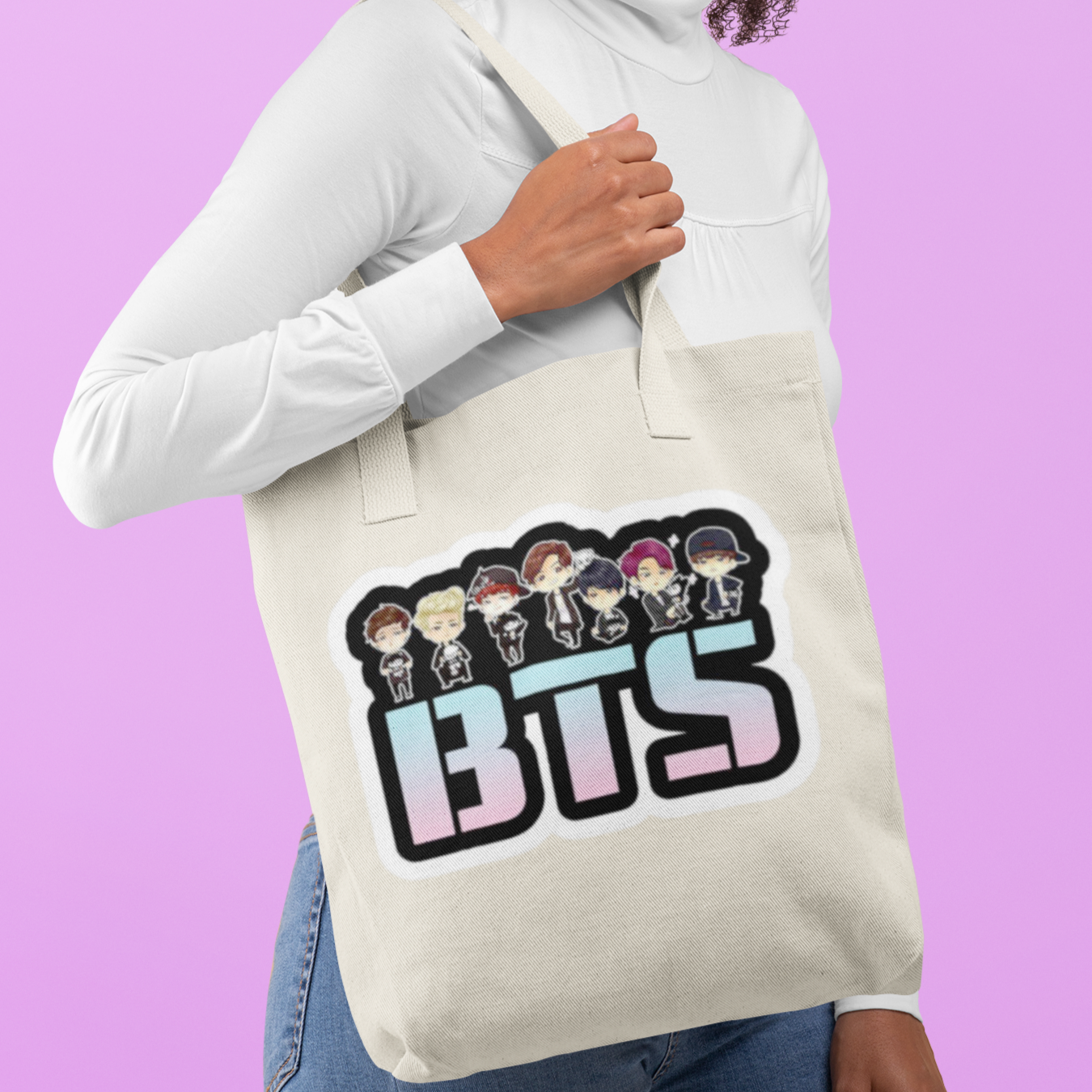 This white zipper tote bag features an animated design of the popular boy band BTS. The durable material and secure zipper closure make it perfect for carrying your essentials while showing off your love for the band. Stay stylish and organized with this must-have bag.
