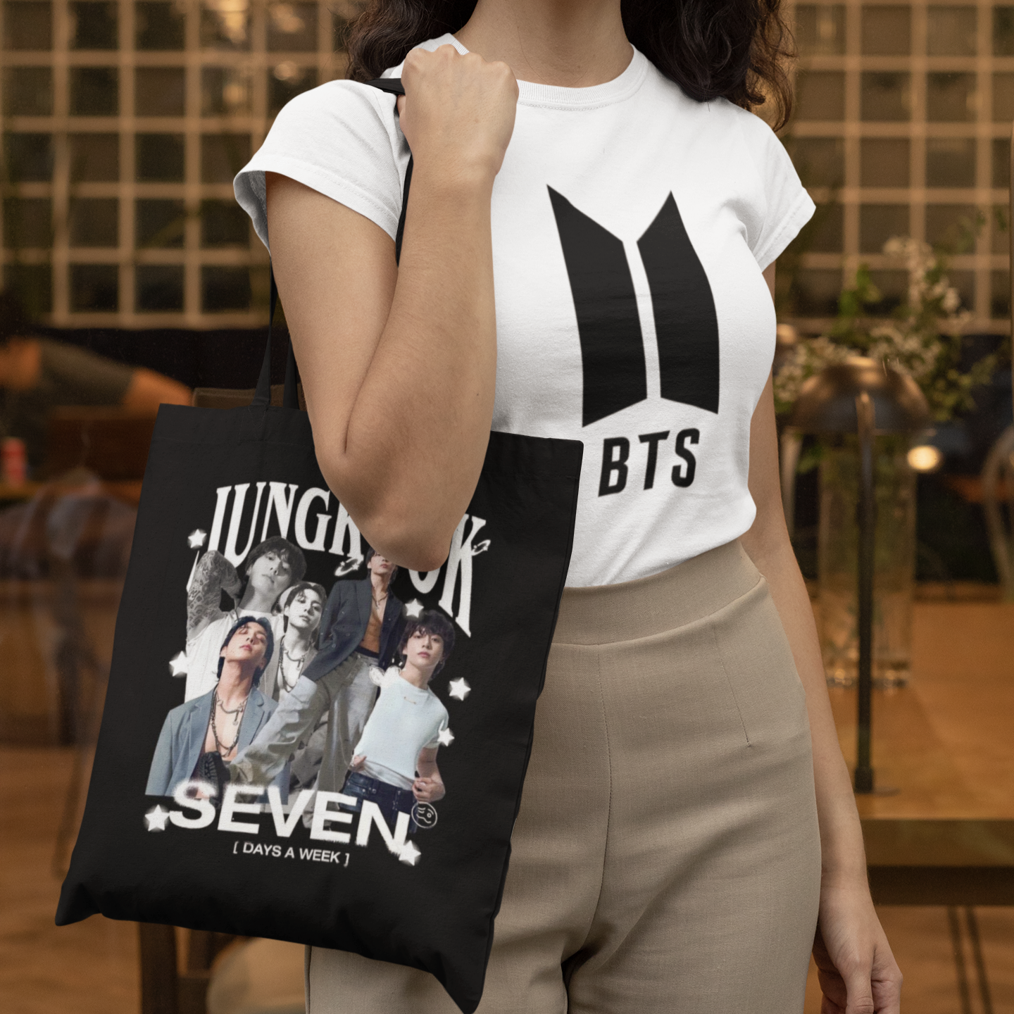 This BTS Jungkook themed black zipper tote bag is the perfect accessory for any fan. The durable design, featuring the iconic member's image, will keep your belongings secure while showcasing your love for the group. With a professional and stylish look, this bag is a must-have for any fan's collection.