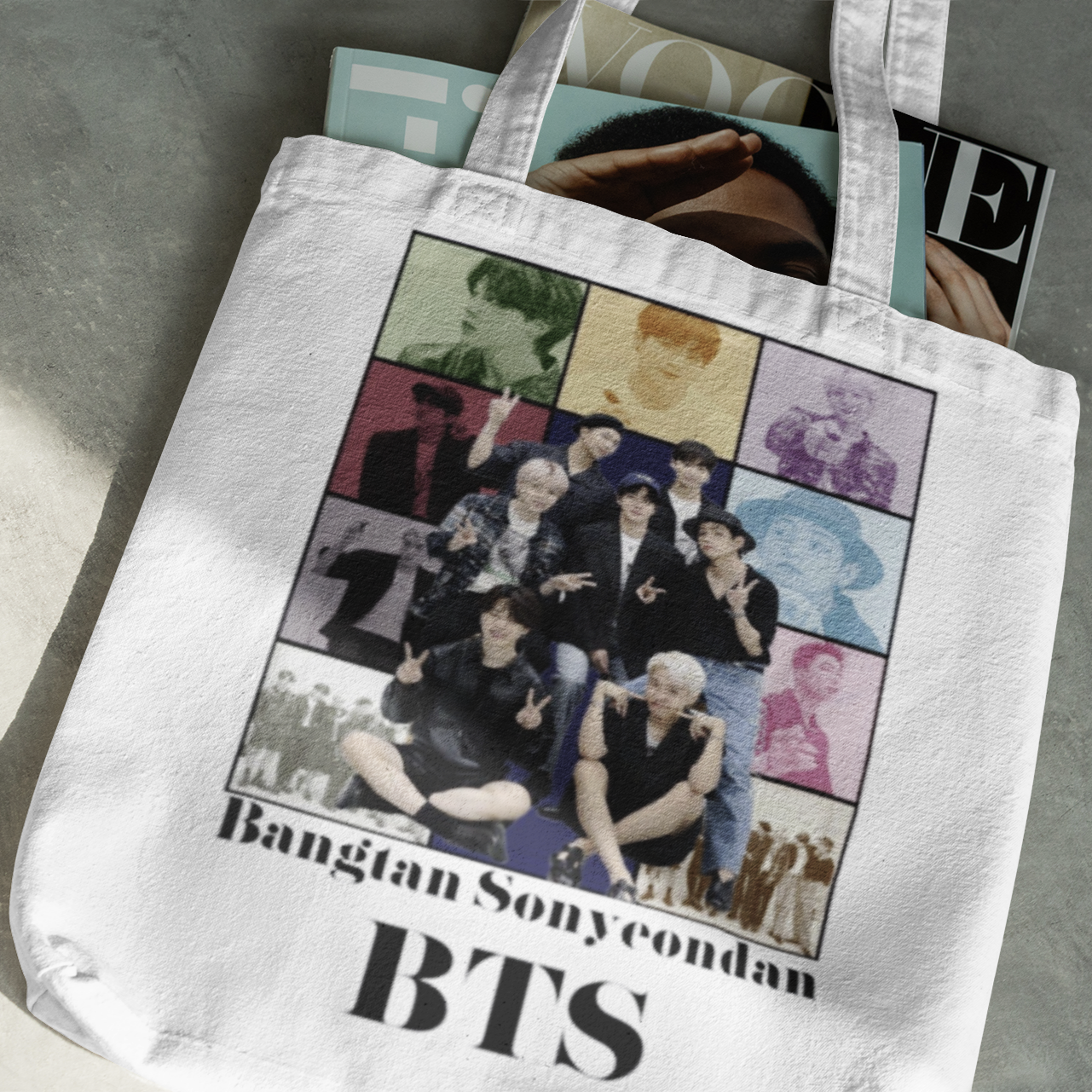 Expertly designed with BTS's iconic image, this white zipper tote bag is a must-have for any fan. Made with premium materials, it offers both style and durability. With its spacious interior and secure zipper closure, it's perfect for carrying essentials while showing off your love for BTS.